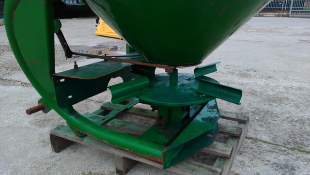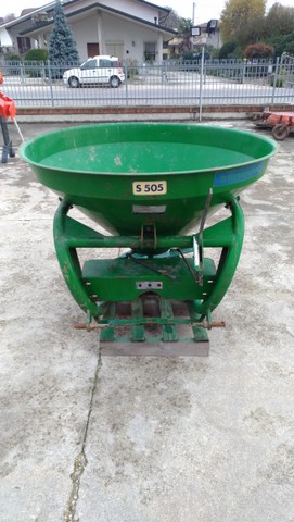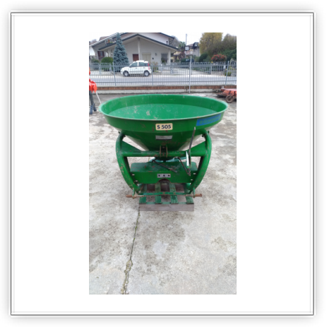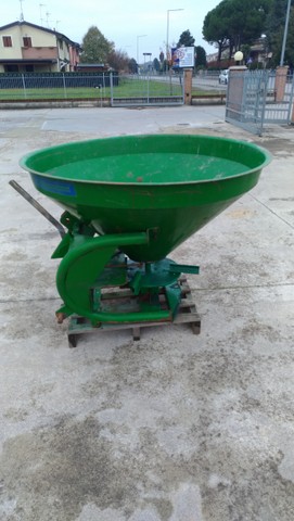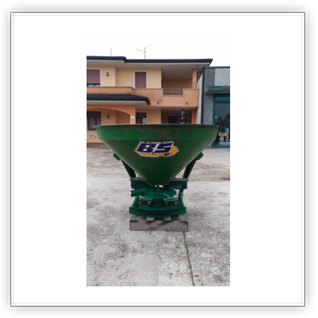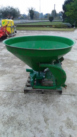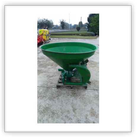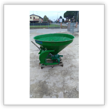 Descrizione | Capacità 500 litri Tramoggia conica doppia con 2 fori di uscita Disco distributore singolo con 4 palette regolabili Serrande in acciaio inox Agitatore Attacco a 3 punti I-II cat. Leva manuale apertura dosatore |